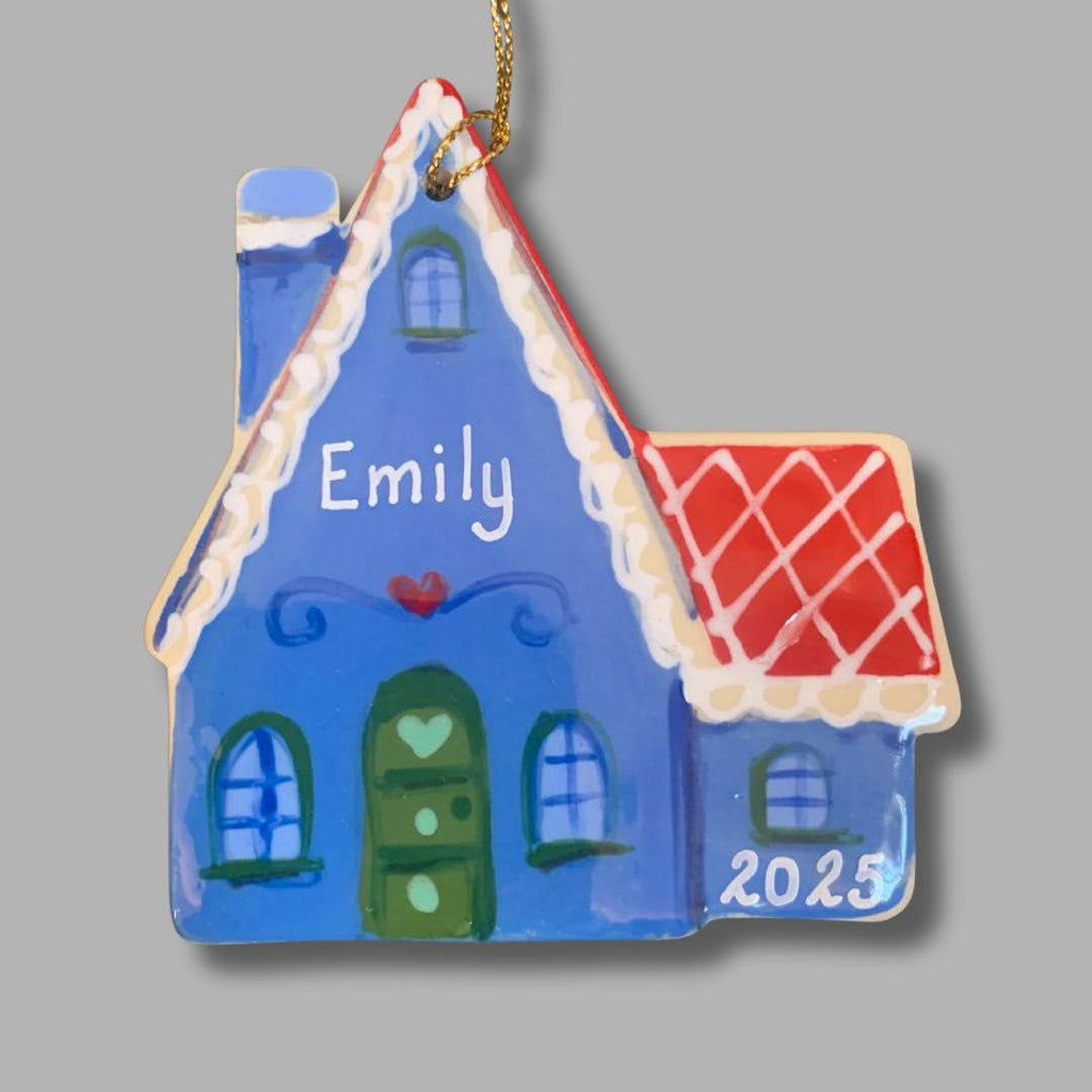 Our House Ornament is approximately 3" by 4".  Personalize the front with a family name and year.  Every ornament varies slightly in design. All personalization is done with a paint pen which is semi-permanent.  To have permanent personalization (under the glaze) select option below.